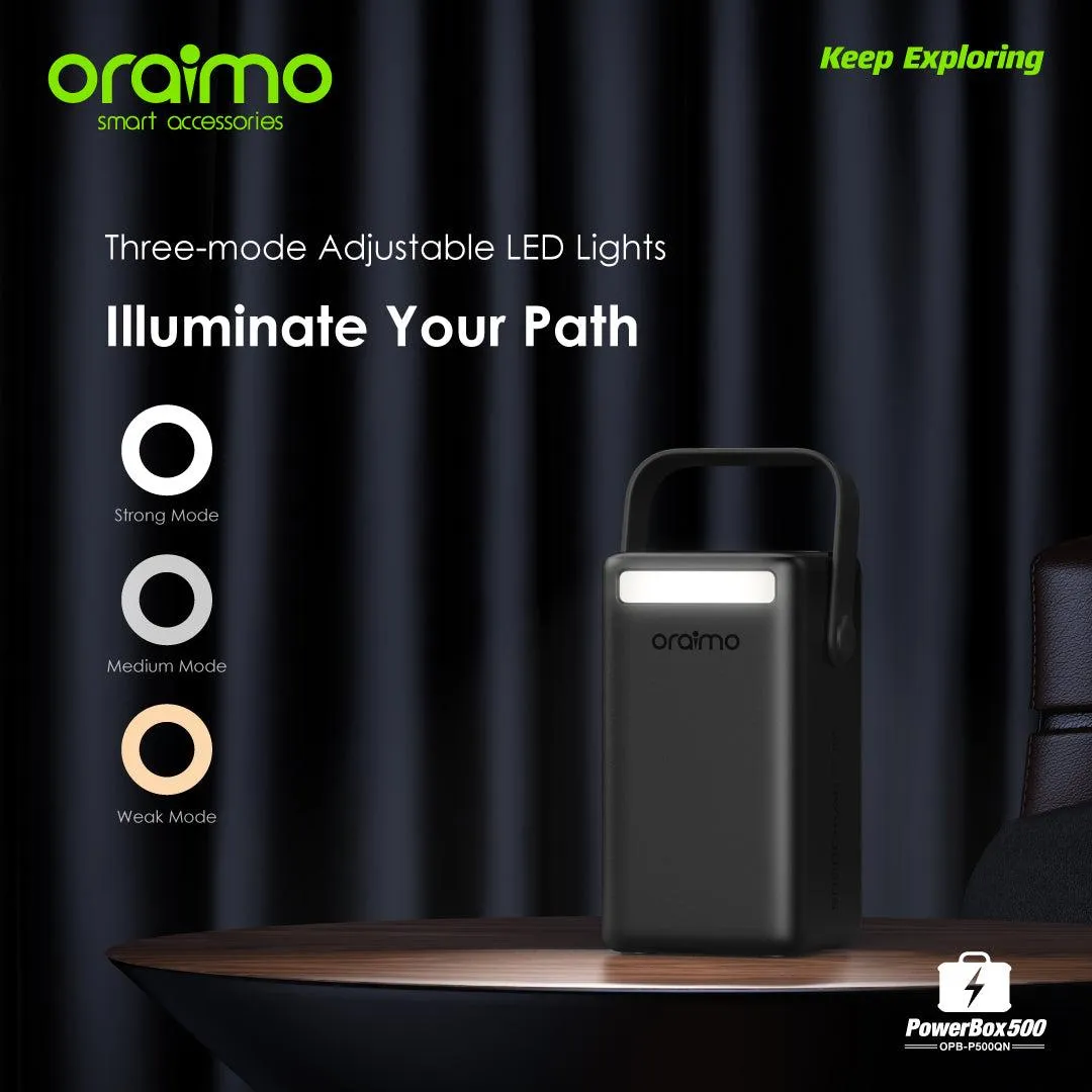 Beyond charging, the oraimo PowerBox 500 comes equipped with a three-mode adjustable LED light system. A long press on the power button activates the light, while short presses allow users to switch between different brightness levels. Whether you need a soft glow for reading, medium light for daily use, or strong brightness for emergencies, this feature adds valuable utility. Another long press switches the light off—easy and efficient.